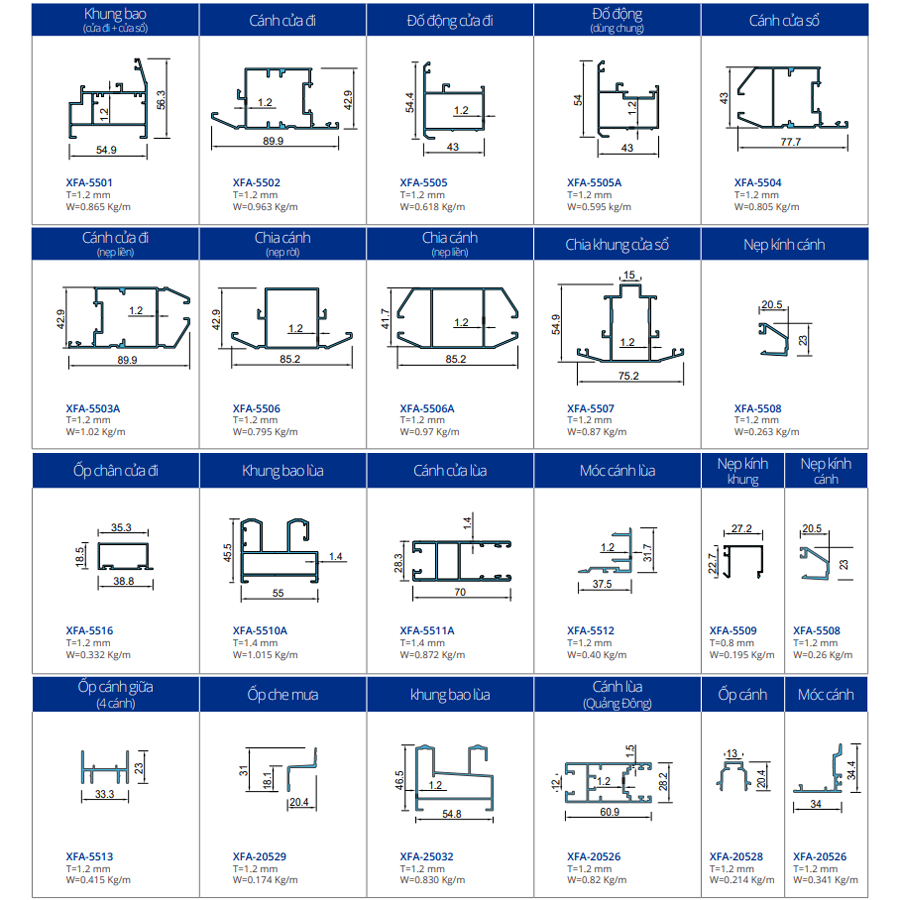 THÔNG SỐ SẢN PHẨM NHÔM HỆ XFA 55 VÁT CẠNH |
