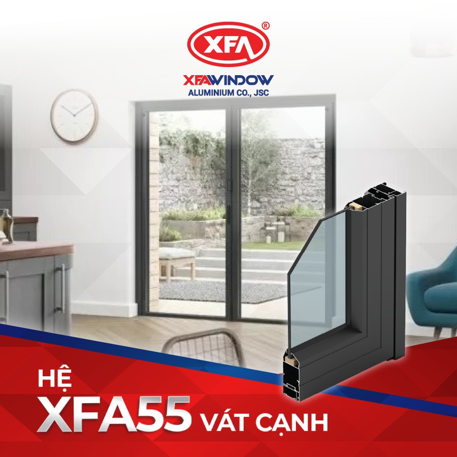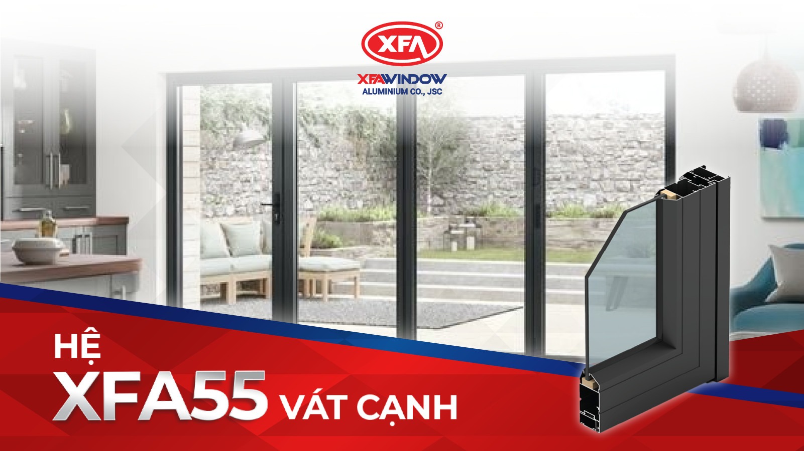 Nhôm hệ vát cạnh XFA 55 là một dòng sản phẩm nhôm phổ biến, được biết đến với kích thước thanh profile bản rộng 55 mm và thanh cánh cửa nhôm xingfa được thiết kế liền sập, vát cạnh. Điều này tạo nên cấu trúc hộp với độ dày từ 1.2 mm. Hệ nhôm XFA 55 vát cạnh được ứng dụng rộng rãi, từ cửa đi, cửa sổ mở quay, đến cửa trượt và vách kính, tuỳ thuộc vào nhu cầu sử dụng. Thanh nhôm xingfa có các đường vát cạnh tăng tính thẩm mỹ, hạn chế tối đa bụi bẩn và nước bám vào các khe cửa giúp dễ dàng vệ sinh. Vật liệu được sử dụng rộng khắp cho các công trình nhà dân dụng, cao ốc và văn phòng.
