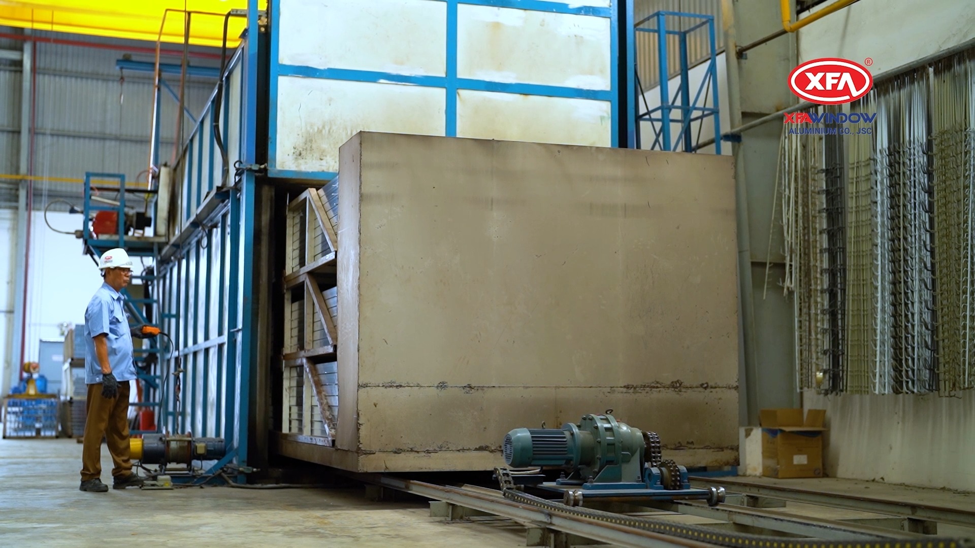 Hóa Già Tăng Cứng: Các thanh nhôm được đưa vào lò để hóa già ở nhiệt độ khoảng 205°C trong khoảng 3 tiếng, sau đó làm nguội bằng quạt công nghiệp. Quá trình này giúp tăng độ cứng và cải thiện các tính chất cơ học của nhôm.