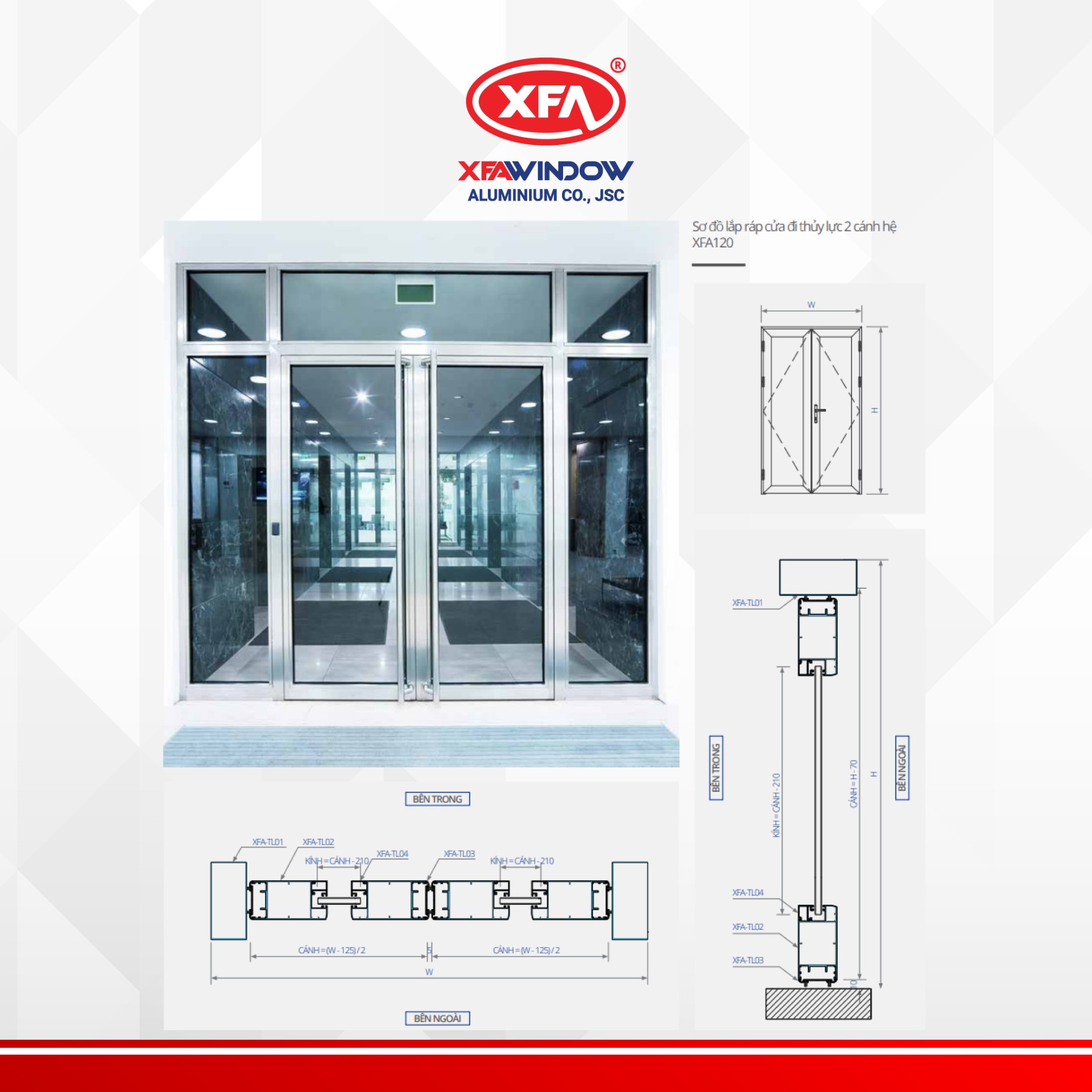 Với chiều rộng khung 120mm và chiều dày nhôm 2.0mm, hệ thủy lực XFA120 thể hiện sự vững chắc và cứng cáp. Cùng với chiều dày kính linh hoạt từ 6-21mm, sản phẩm đáp ứng mọi nhu cầu về thiết kế và an toàn.