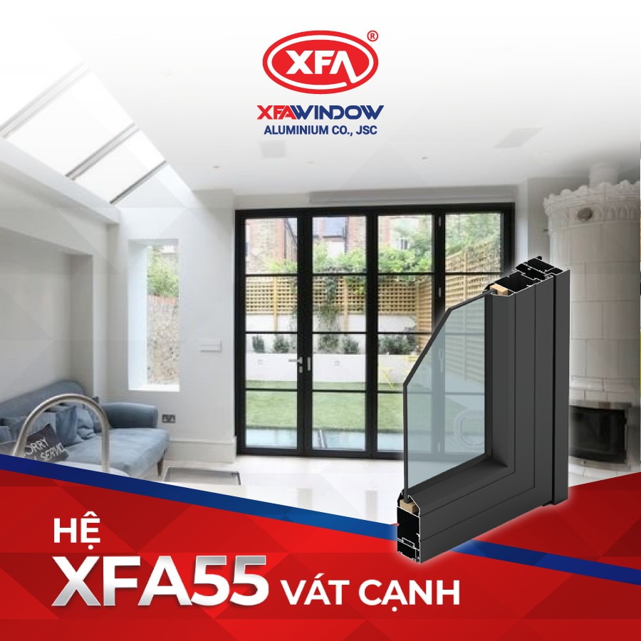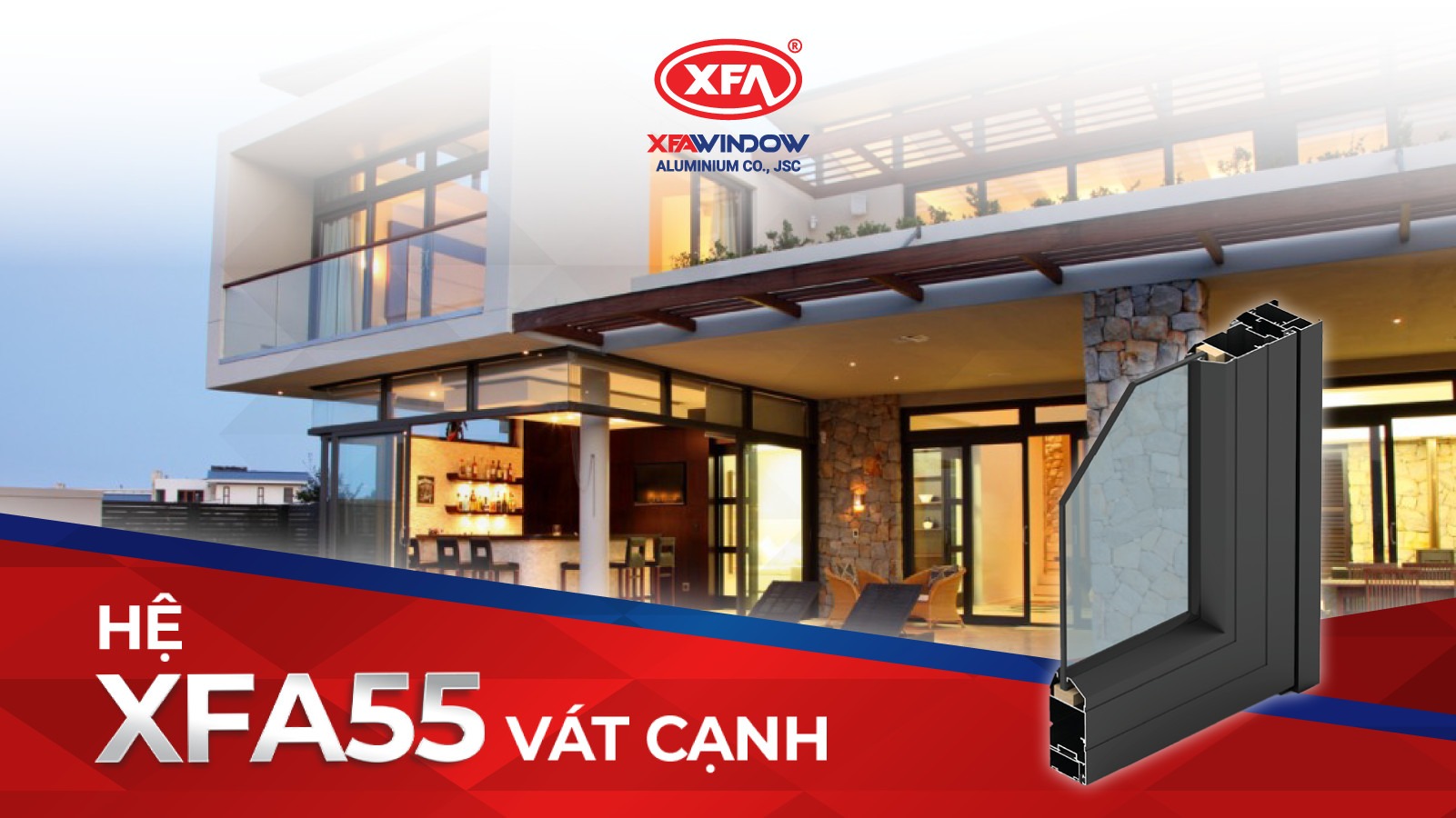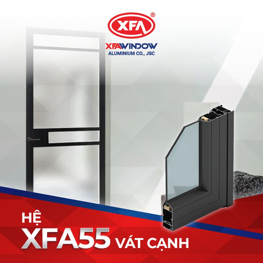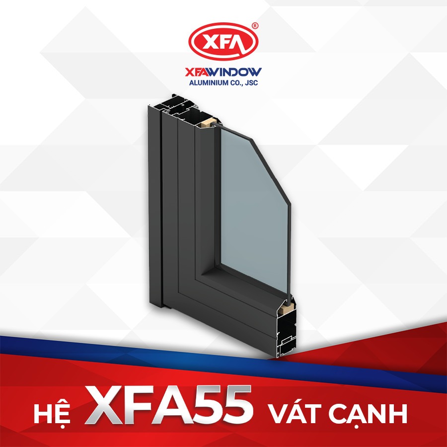 Nhôm hệ vát cạnh XFA 55 là một dòng sản phẩm nhôm phổ biến, được biết đến với kích thước thanh profile bản rộng 55 mm và thanh cánh cửa nhôm xingfa được thiết kế liền sập, vát cạnh. Điều này tạo nên cấu trúc hộp với độ dày từ 1.2 mm. Hệ nhôm XFA 55 vát cạnh được ứng dụng rộng rãi, từ cửa đi, cửa sổ mở quay, đến cửa trượt và vách kính, tuỳ thuộc vào nhu cầu sử dụng. Thanh nhôm xingfa có các đường vát cạnh tăng tính thẩm mỹ, hạn chế tối đa bụi bẩn và nước bám vào các khe cửa giúp dễ dàng vệ sinh. Vật liệu được sử dụng rộng khắp cho các công trình nhà dân dụng, cao ốc và văn phòng.